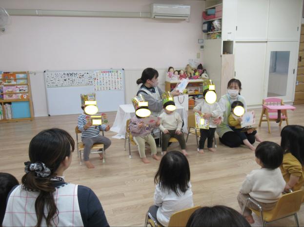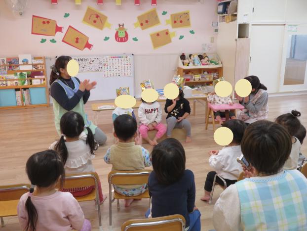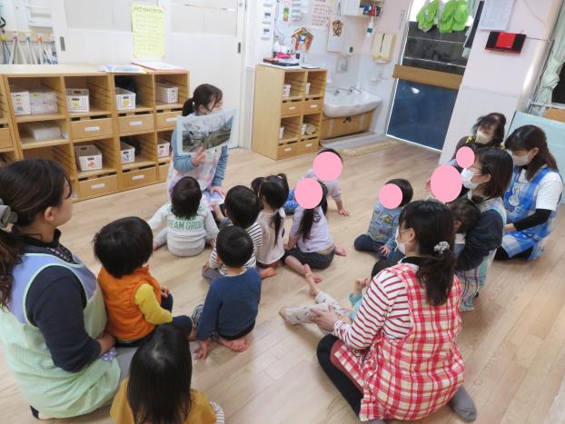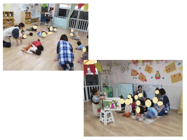 リズム遊びではピアノを聞いて体を動かしたり、朝の集会では絵本を見ました。
