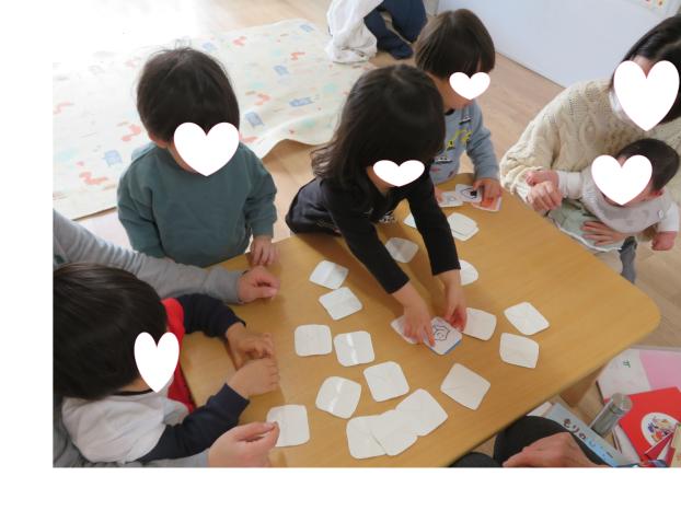 「せんべいせんべいやけた♪」の、わらべうたでカードをひっくり返したり、コマを回したり一緒に参加して楽しみました(*^_^*)