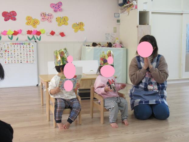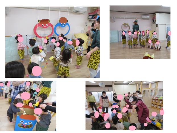 くまグループさんは鬼のパンツを履いて、自分達で作った鬼のお面をつけて、鬼のパンツの体操を踊ってもらいました!節分の由来のお話も真剣に聞く子ども達です。その後鬼が登場!!鬼に向かって「鬼は外~!福は内~!」と手作りお豆を投げました!!無事に鬼をやっつけ福の神にもやってきてもらいました。今年も一年健康で幸せに過ごせますように。