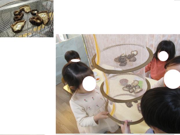 たくさん収穫したしいたけを、干し野菜用のネットに入れて干ししいたけ作りをしました。