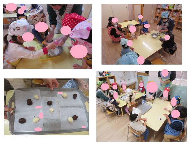 保育士が材料を入れて、こねる姿を興味津々で見ている子ども達でした。プレーンとココアと2つの味を作り、一つ一つ丁寧に丸めることができました。おやつに食べるのがとっても楽しみです(^^)!