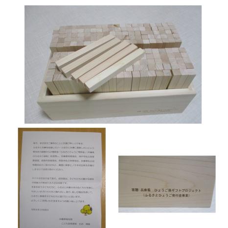 兵庫県ひょうご孫ギフトプロジェクト(ふるさとひょうご寄付金事業)から木材玩具が届きました。