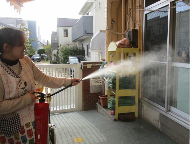 にじ組の窓側を火元に見立て、保育士が園庭で消火訓練をしました。