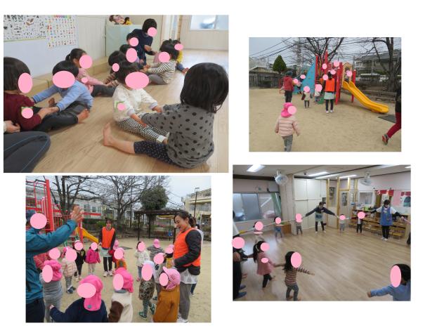 昨日、2歳児のくまグループと1歳児のうさぎグループ、参加できる職員でリズムあそびのDVDを見ました。その後みんなで体を動かしました。