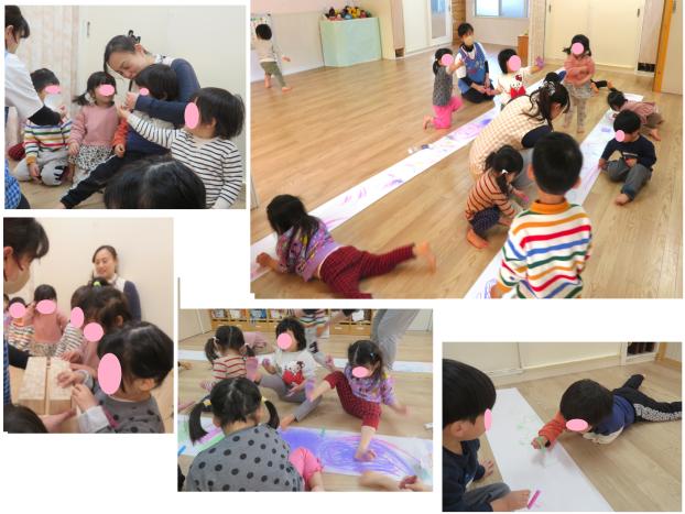 お部屋に広げた和紙いっぱいに、チョークでお絵描きすると、手にチョークの粉がついて手形のスタンプができるのを発見!!他のお友だちも同じようにペタペタ・・・。手だけでなく足型もつけながら和紙いっぱいに描いていましたよ!!