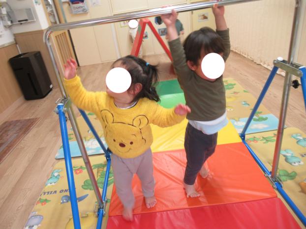 保育士が少し手を添えて鉄棒をつかむと、とても嬉しそうでした!