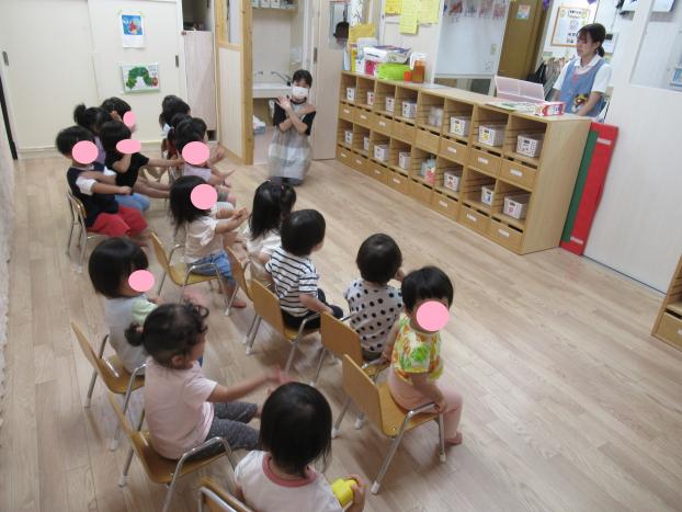 いつもにじ組では、おやつの後にお歌を唄ったり、絵本を見たり、今日何して遊んだの?明日の予定は~などのお話をして『終わりの会』をしています。