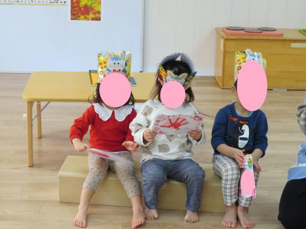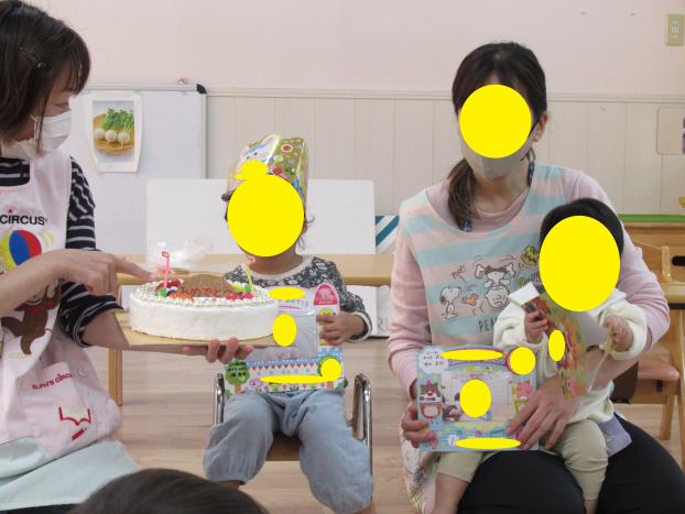 「お誕生日のお友だち誰かな?」と聞くと「はーい」と元気に手を挙げて教えてくれましたよ。冠とメッセージカードのプレゼントをもらいました。