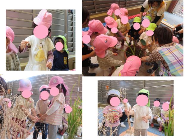 毎日お水やりをして、収穫を待ち遠しく思っていた里芋と稲を収穫しました!みんなで「うんとこしょ、どっこいしょ」と声をかけ引っ張ってくれました。元気に育ったのもみんなのお水やりとかかしさんのおかげだね♪給食で食べるのが楽しみにしてます!