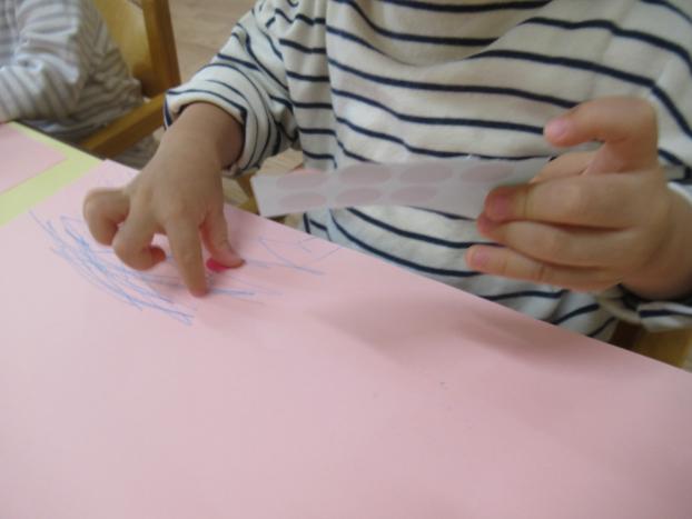 クレパスでおえかきをした後にシール貼りもしました!