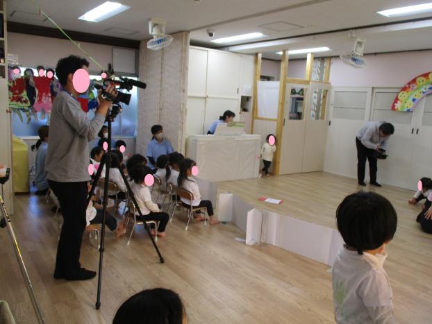 劇団風の子の方に来ていただき、「タックンとおりがみおじさん」のお話を聞きました。いつもと違う場所に緊張しながらも、お話が始まると、集中して見入っていました。