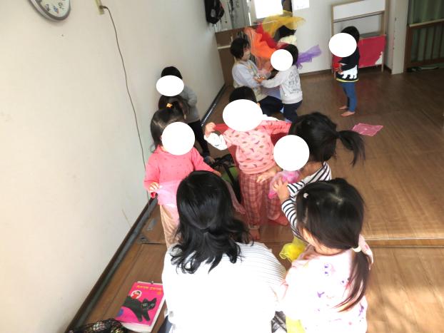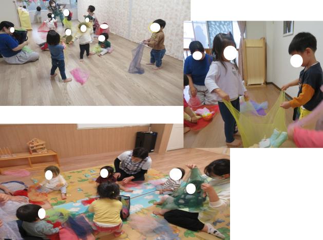 シフォン布の上に人形を乗せてお友だちと一緒に持ちゆらゆら揺らしていました。