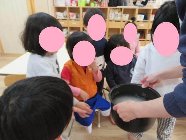 にじ組で作ったお米を使って給食に食べるご飯を炊飯器で炊きました。前日に白米と玄米を見比べて触ったりもしました。今日は、白米と子どもたちが脱穀ともみすりしてくれた玄米と合わせて炊き上げました。