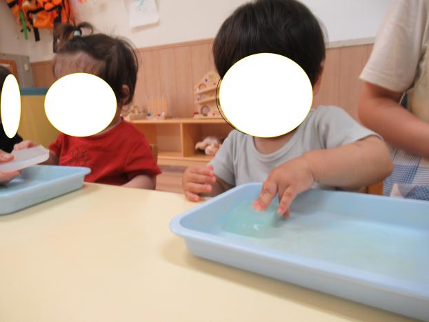 寒天の感触遊びをしました。「冷た~い!」や「プルプルしてる~」と楽しそうに手で触り、感触をたのしみました!青と赤の色が混ざりあい、紫になっているのをみて不思議そうな子ども達でしたよ☆