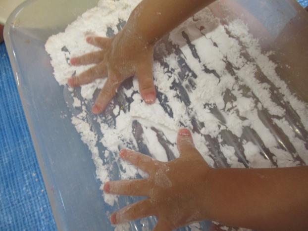 トレーに粉を入れるとみんな手を伸ばしサラサラの感触を存分に楽しみました。