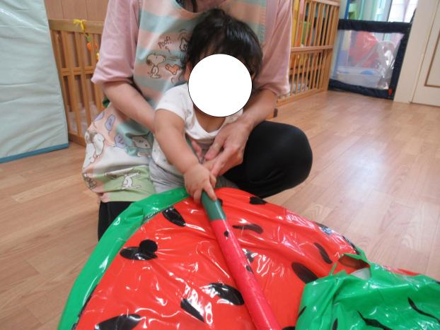 今日はビーチボールのすいかを使ってすいか割り遊びをしました。