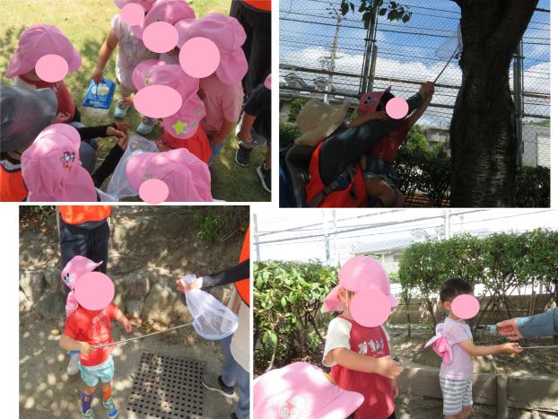 虫取り網をもって元気いっぱいに出発!どこにいるかみんなで探し、先生と一緒に上手に網を使って4匹も捕まえることができました!