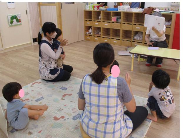 ラグマットにリラックスして座り、絵本や紙芝居、歌などを楽しみました。