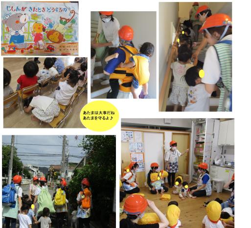 地震(避難訓練)後すぐ外にはでず、落ち着いた後、くまグループは靴を履き保育士と手をつなぎ、うさぎグループ、ひよこグループは避難用おんぶ紐や避難車、4人用バギーを使い避難出来ました。
