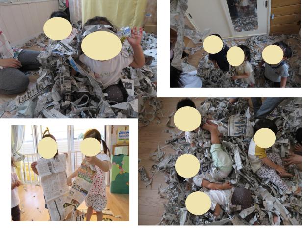 たくさんの新聞を細長くちぎって新聞プールを作ると勢いよく入っていた子ども達!