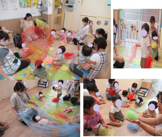 お部屋でもよく遊んでいるシフォン布を使って「じーじーばー」や「にぎりぱっちり」を一緒にしました。