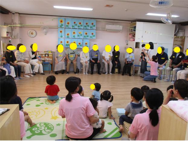 つどいでは、くまグループさんがお歌のプレゼント♪おじいちゃんおばあちゃん達に拍手をしてもらい嬉しそうにしていました!わらべ歌遊びではこどもたちもおじいちゃんおばあちゃんと触れ合って恥ずかしそうにしたり、甘えたりしていました。最後に子どもたちが作ったしおりのプレゼントを渡しました。