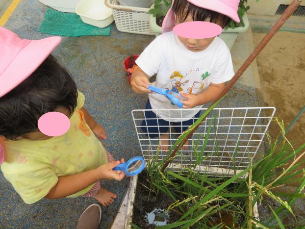 園庭で育てている稲を虫メガネで観察しました。