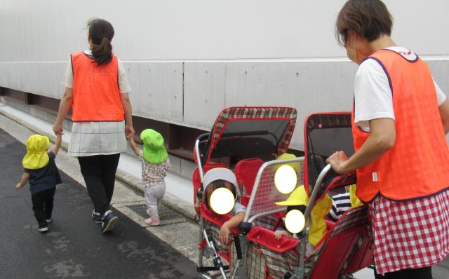 歩けるようになった子は靴を履いて嬉しそうな様子、散歩車に乗るお友達もいて出発です!