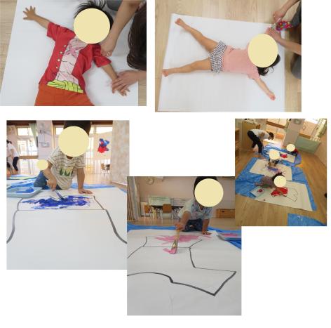 みんなの身体で型を取り、絵の具で色を塗りました。