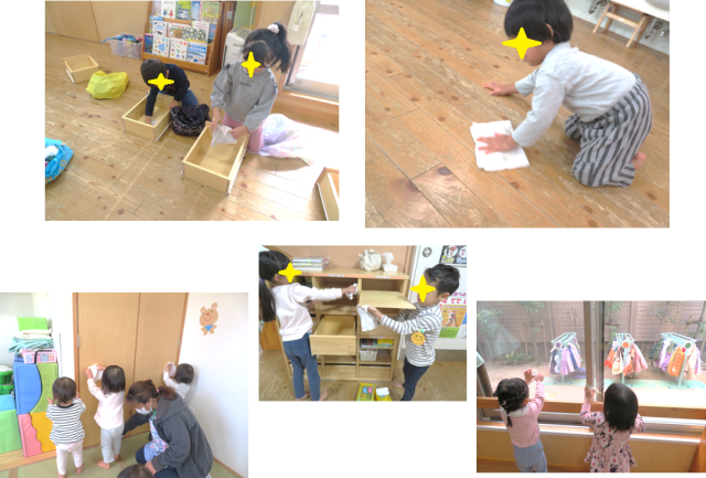 幼児クラスは、「部屋のすみっこまで掃除する!」と言って丁寧にお掃除してくれましたよ。