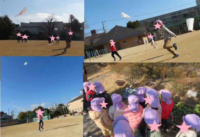 グラウンドを走り回り凧を上げていました。どんどん高くあがる凧♪