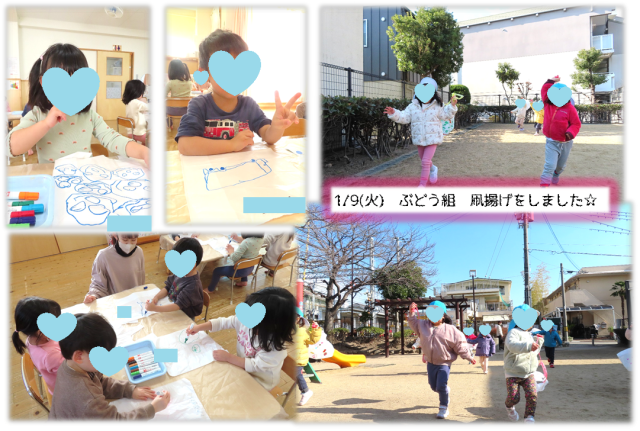 凧を作りました。自分の顔やママの顔、動物や乗り物など