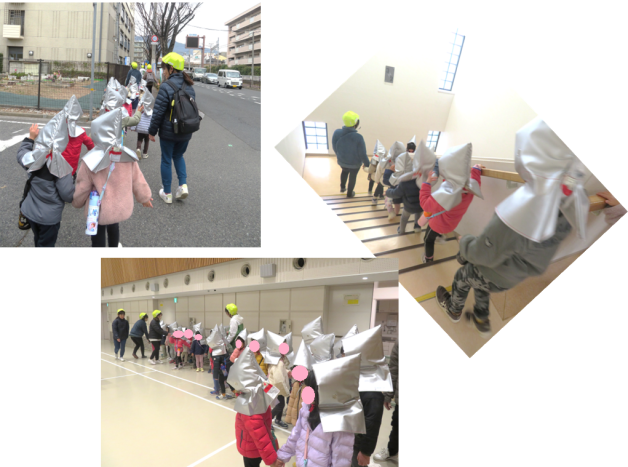 すいか組、みかん組が上宮川文化センターまで避難訓練を行いました。大津波警報が発令されたとき、園舎が危険になった時は、上宮川文化センターまで避難することになっています。出発前に、地震発生時の身を守る方法や、防災頭巾の被り方などをみんなで確認しました。先日の能登半島地震で、芦屋市も揺れたのでその時のことを思い出し、「ダンゴムシになってしゃがんだよ」と教えてくれました。日頃の訓練がしっかり身についていることを実感しました。