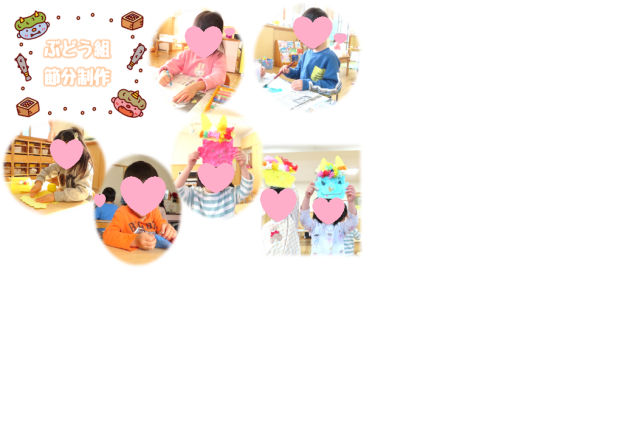 節分制作をしました。おりがみを折って「赤鬼」「青鬼」「イワシの頭」「ひいらぎの葉」を作りました!おりがみも上達してきて色んなものに挑戦しています!