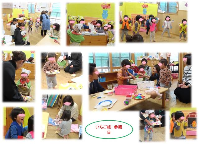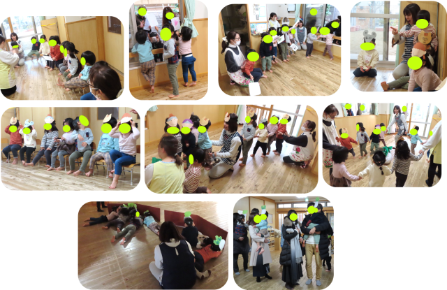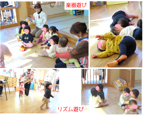 保育参観では手遊びに楽器遊び、体操・リズム遊びと保護者の方が見守る中緊張した表情でしたが、誰も泣かずに遊ぶ様子を見てもらえました。