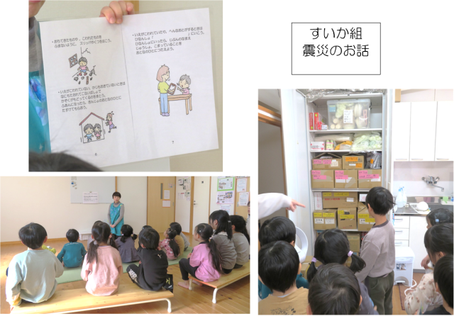 今月の訓練担当の保育士から、紙芝居と「お・は・し・も」の話を聞き、避難についての知識を深めることができました。