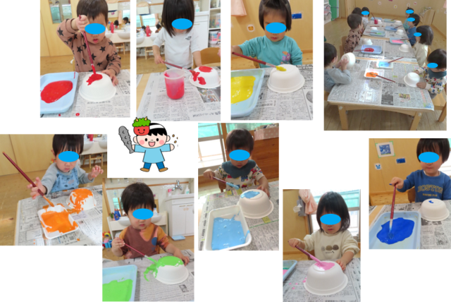 今日は筆を使ってお椀型の紙皿に色を塗りました。