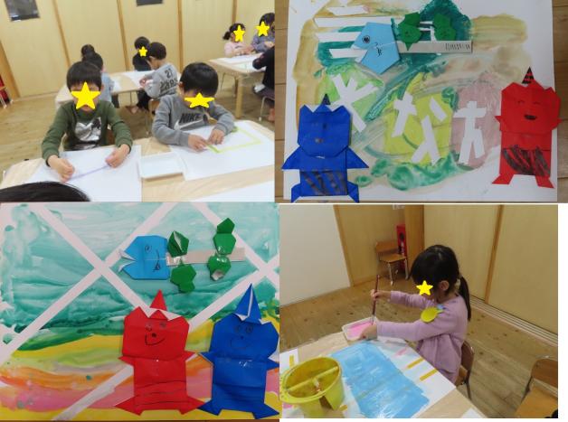 おりがみを貼る紙には、マスキングテープを貼って、その上から絵の具を塗り、とても面白い作品が出来上がりました!クラスに飾ってますので、ぜひご覧ください!