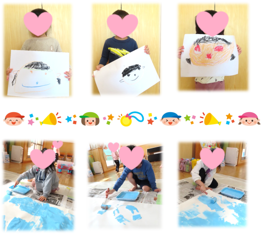 現在、参観日に向けてクラス旗を制作しています。自分の似顔絵を描き、模造紙に色を塗りました。「わらったかおにしよう」「くちはあかにしよう」と個性豊かな似顔絵が完成✧✧まだまだ制作途中ですが「どんな旗が完成するのかな」と楽しみにしています。