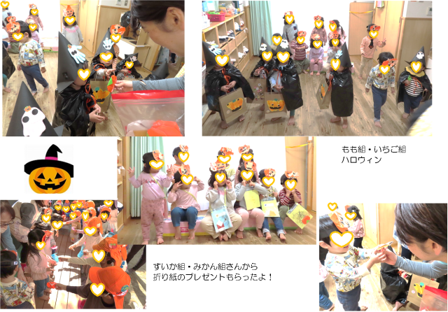 今日はハロウィンですね!可愛く変装した子ども達が事務所や幼児クラスにやってきました。すいか組、みかん組のお兄ちゃん、お姉ちゃんにから可愛い折り紙をもらって大喜び!「たくさんもらったよー」と宝物バックをみせてくれました!みんな楽しかったね(^^♪