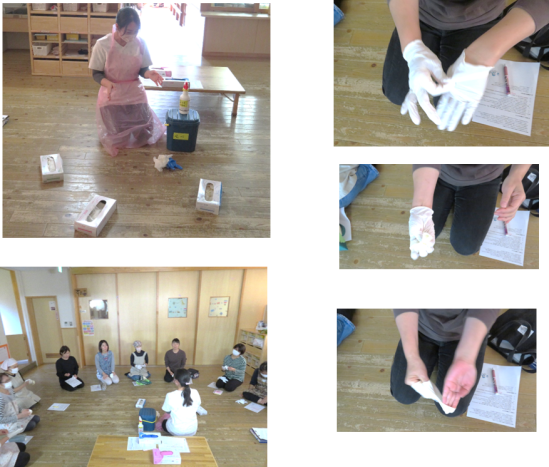 消毒の仕方、手袋、エプロンの着脱方法、子ども達の誘導などを学びました。
