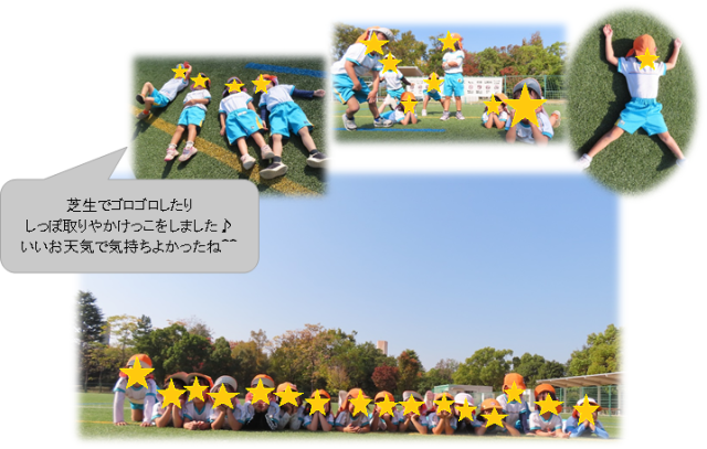 公園の芝生で、しっぽ取りやだるまさんがころんだをして遊んだり、