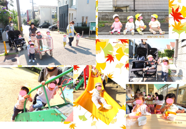 若宮町の住宅敷地内を自由に歩いてお散歩したりお友だちが来るのを待って「お~い」と呼んでみたりと子ども達ものびのびゆったりお散歩を楽しみました。