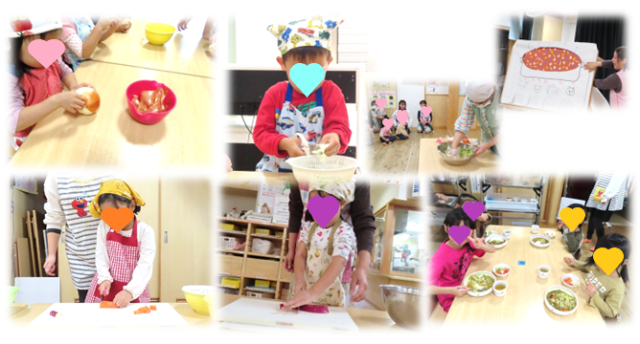 「おいしーい」「あっという間に食べちゃうよ」「おかわり絶対にするんだ」と笑顔で口いっぱいに頬張って食べていました。野菜が苦手な子も「自分でつくった。みんなでつくった。」ということもあって、「今日は食べれそう。」と言って食べたりもしていました。