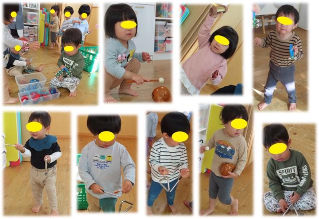 誰も泣くことなくマラカスや鈴、ギロに木魚とバラエティー豊かな楽器を「やまのおんがくか」「おもちゃのチャチャチャ」に合わせて音を鳴らしていました。