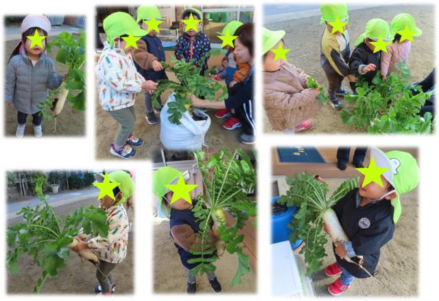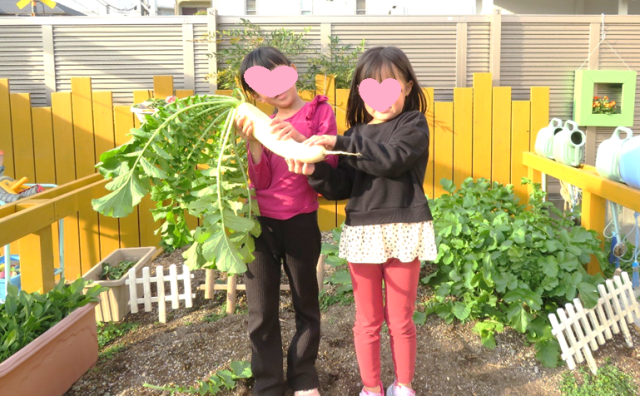 園庭で育てていた、大根とカブを収穫しました。