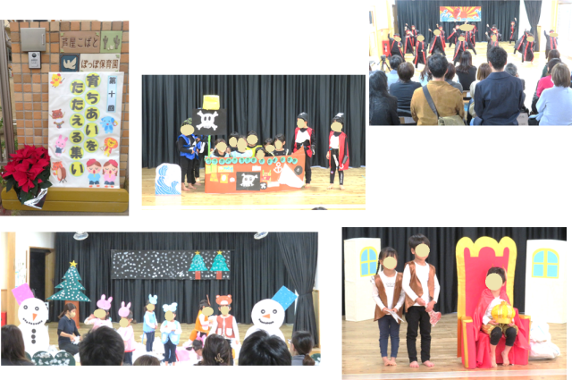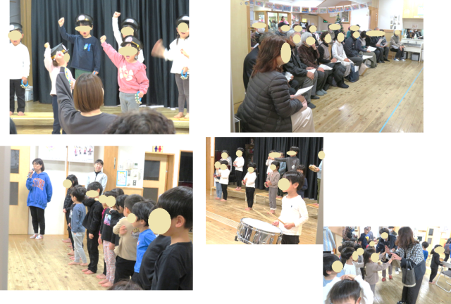 ポカポカ陽気に恵まれ、幼児クラスの育ちあいをたたえる集いがありました。朝から、ドキドキ緊張した表情の子ども達でしたが、劇、歌、合奏、ソーラン節が終わると、ほっとしてどの子も笑顔でした(^^♪