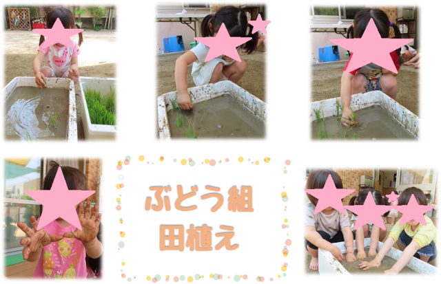 今日は田植えをしました。稲を植える前に泥を触ると「つめたーい!」「どろどろしている!」と大喜び!!手や足に泥がついてもへっちゃら!泥が付いた手や足を友達と見せ合っていました。一人ずつ稲を植えると「まだしたい!」と言子ども達!たくさんの稲を植え、ぶどう組の田んぼが完成☆たくさんのお米ができるようにみんなで大切に育てていきたいと思います。