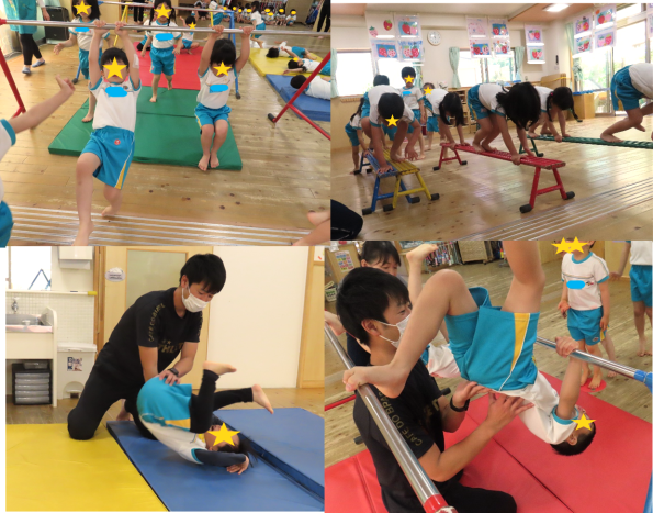 「やってみたいひと~?」の声に「はーい!」と手をあげたりして、どんどん挑戦していました。鉄棒にマットに平均台にとたくさん身体を動かしました!