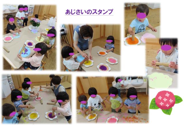 スタンプを、ぎゅーと画用紙につける子やトントンとリズム良く花びらを